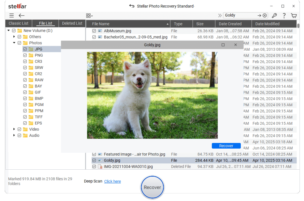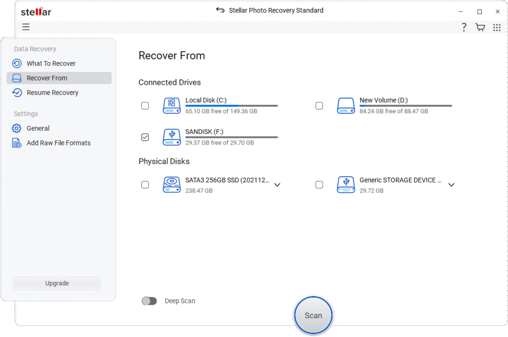 Let’s start with the simplest method first! If you are looking for a simple and direct approach to restore your lost photos, try third-party photo recovery software such as Stellar Photo Recovery. This professional software performs a thorough scanning of your storage device, including SD cards, at a deeper level, locating and reconstructing these lost files. It supports a wide range of file formats such as JPG, PNG, RAW, and more, making it ideal for photographers.